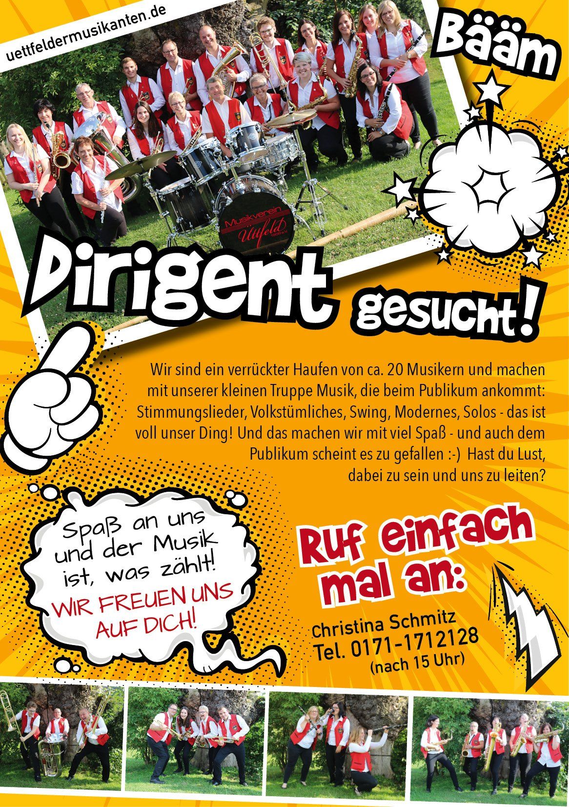 Wir sind ein verrückter Haufen von ca. 20 Musikern und machen mit unserer kleinen Truppe Musik die beim Publikum ankommt! Doch es fehlt uns leider noch ein Dirigent. Hast du vielleicht Lust oder kennst du jemanden der Interesse daran hätte? Dann ruf bei Christina Schmitz unter der nebenstehenden Nummer an oder schreib uns eine Mail an kontakt@uettfeldermusikanten.de. Du kannst auch unser Kontaktformular verwenden:
